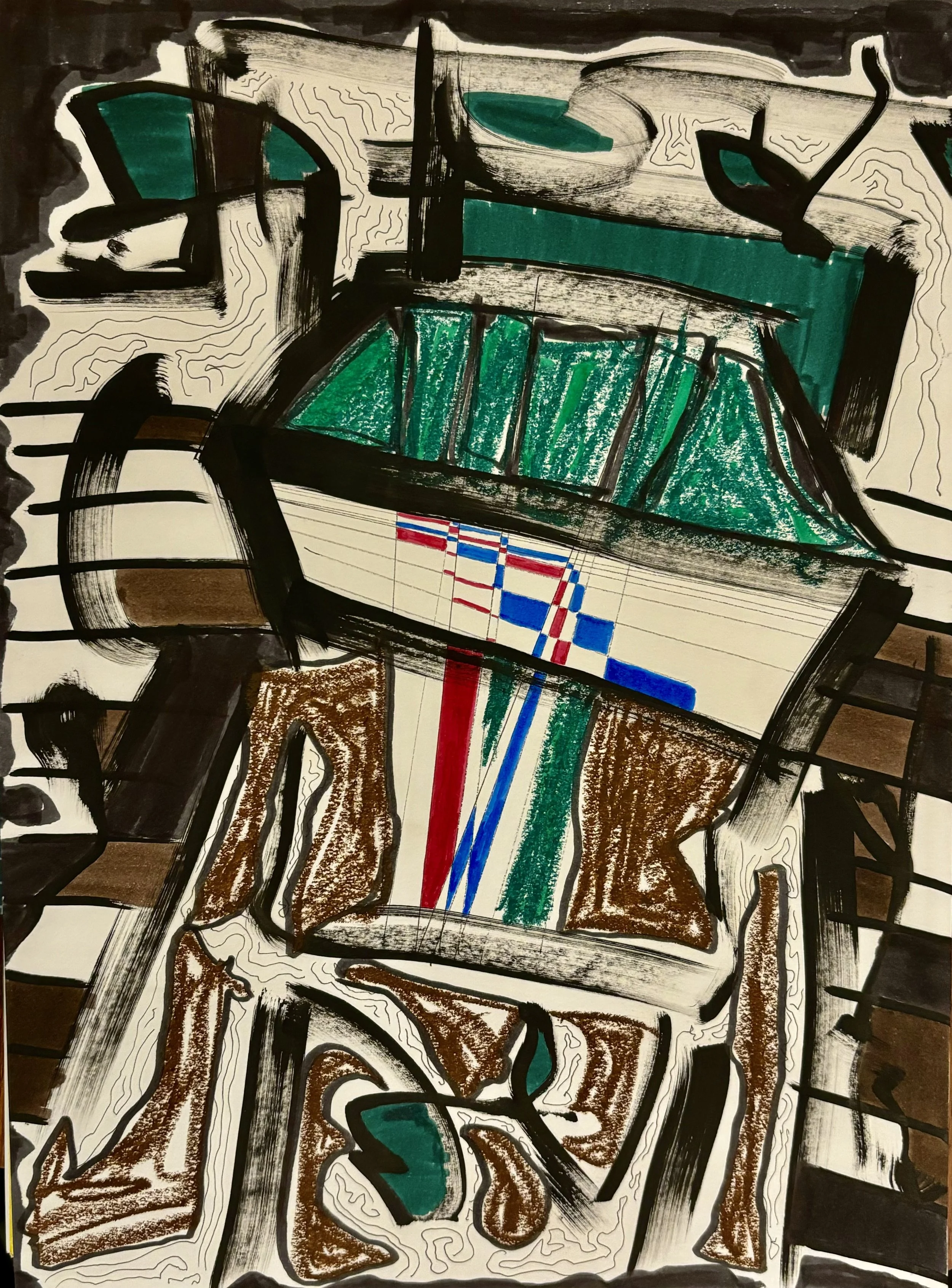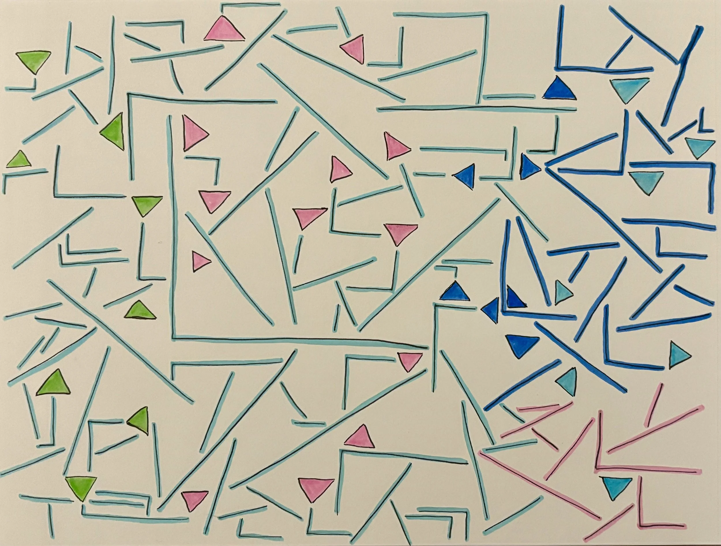 Here were a couple drawings I did before the doc flustered me. You can see that I naturally reacted from the first drawing (orderly geometric triangles and lines) to create the second drawing (disorderly something something). So I was already starting and reacting (and not knowing who I was). And it’s good!